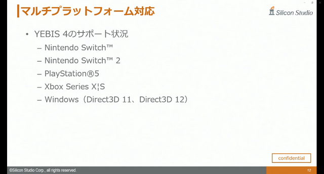 「YEBIS4」はC++ヘッダとライブラリ構成のミドルウェアで、基本的にはポストプロセスに特化したシンプルな仕組みのため、エンジン側への干渉が非常に少ないこともポイント。ほとんどのエンジンに組み込み可能なほか、現在はSwitchとSwitch2、PS5にXbox Series X|Sと、コンシューマ機を幅広くサポートしています。WindowsでもDirect3Dの11と12に対応しており、この「組み込みやすさ」と「マルチプラットフォーム対応」も魅力として紹介されました。