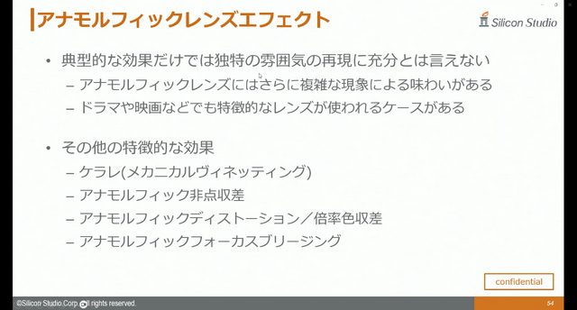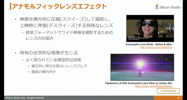 ここで川瀬氏は「特徴のあるレンズでは実際にはさまざまな固有の効果が生じているので、典型的な効果だけを表現しても雰囲気の再現には十分とは言えません」と指摘。そこでセッションではシンプルなアナモルフィックレンズのみの表現と、特殊なブラーなど他の効果も加えてより雰囲気を追求した2枚の画像が比較され、あらゆる特徴的な効果をサポートしていることで独特な雰囲気を持つ映像作りを可能にしていることが解説されました。