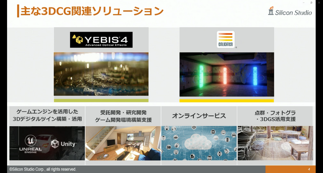 今回のテーマとなっているミドルウェア以外にも、グローバルイルミネーションミドルウェア「Enlighten(エンライトゥン)」などのソリューションを展開。そして非エンタメ業界向けにゲームエンジンを活用したデジタルツインの構築なども手がけています。