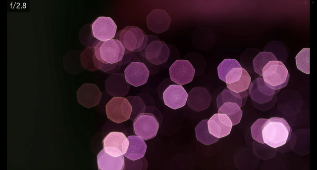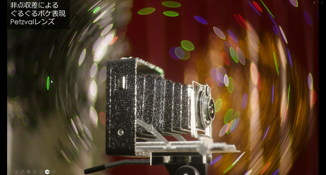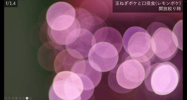シミュレーション可能なボケ方はまだまだあり、続いてはレンズに向かって斜めから入ってくる光が鏡筒によって遮蔽されることで起こる「キャッツアイ」や「レモンボケ」と言われるエフェクトについて。こちらも「YEBIS4」を使った画像が紹介され、レンズを絞っていくことでボケの形が変化していく表現がサポートされているとのことです。