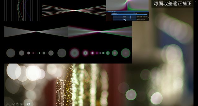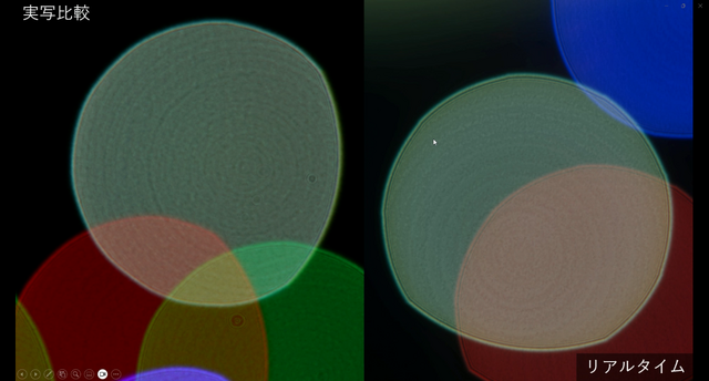 非常に巨大なボケや実写に近いようなボケ表現も可能であり、実写との比較も提示されました。シンプルな見た目の再現だけでなく、アップにしてみることで波長による回折模様などのディティールもシミュレーションできていることが分かります。