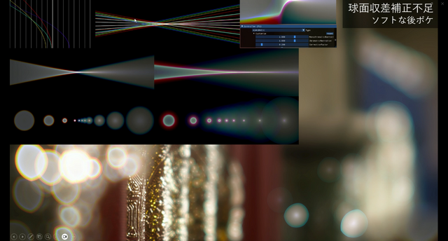 続いては「YEBIS4」のエフェクトについて。「YEBIS4」の被写界深度処理では写実的で多彩なカスタマイズが可能になっており、レンズを通った光が綺麗に1点に集中しないことで起こる「収差」も簡単にシミュレーションできるとのことです。