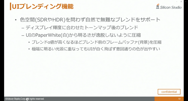 HDRに関連しては「UIブレンディング機能」のサポートも「YEBIS4」のポイントです。まぶしい光源にαブレンドを行うと、正しい計算であっても明るい背景でUIが白飛びしてしまうような“副作用”が発生しがちです。