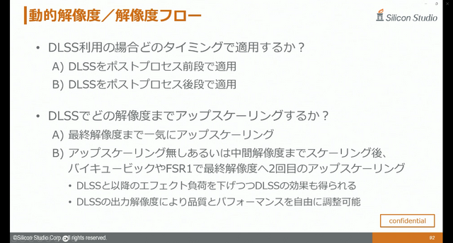 最後のトピックは「解像度フローの戦略」についてです。「YEBIS4」では、さまざまな解像度を柔軟に選択でき、DLSSなどの外部機能も内部で適用可能。さらに、その解像度フローのカスタマイズすることも。