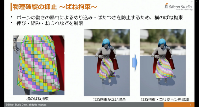 まずは物理破綻の抑止について。揺れものが暴れてめり込む現象を防止するため、ボーンの間に縦・横・斜めに伸び縮みして“ねじれ”などを制限する「バネ拘束」を使用。これにコリジョン判定を持たせることで突き抜けが減りますが、同時にバネを強くすると動きが硬くなるという影響も説明されました。