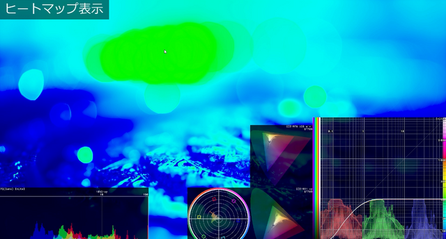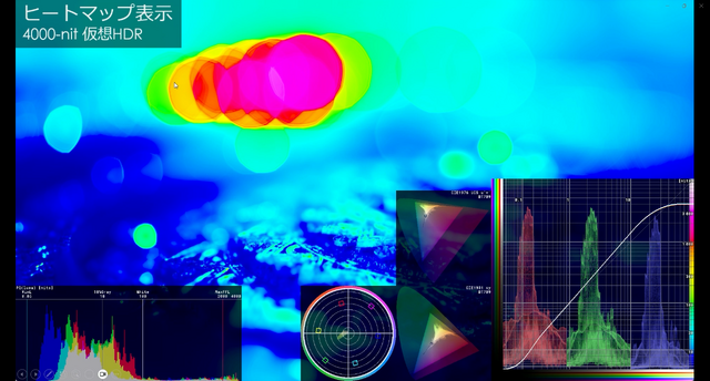 明るさによるヒートマップ表示にも対応。同じヒートマップ表示で4000-nit用の仮想的な出力をした例も合わせて紹介され、比較してみると「明るい部分だけ色が変化し、暗い部分は変化していない」ことが見て取れます。これは「絵作りが全く変わっておらず、白飛びだけに影響している」ことを示しており、出力が変化しても互換性を保てていることを分かりやすく示しています。