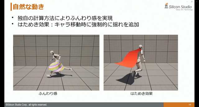 続いては「自然な動き」について。突き抜けないだけでなく、揺れものが自然な動きになるよう独自の計算方法によって“ふんわり感”が追求されています。曹氏によればデザイナーと密にコミュニケーションを取りながら試行錯誤の末に生み出されたものとのことで、マントがはためく際には「移動するときに強制的に揺れを追加」することで、上下に波打つような動きを実現しています。これは物理的には正しい挙動ではないものの、求める自然さに繋がったと曹氏は振り返りました。