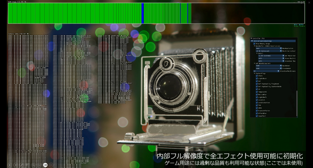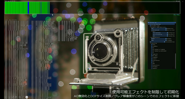 セッションでは一例として「内部フル解像度で全エフェクト使用可能」な状態での初期化時と、そこから解像度やエフェクトを落とした場合の比較画像も紹介されました。画像上部に示された緑色部のテクスチャと青色部のバッファが大きく削減できていることが分かります。