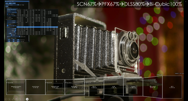さらにDLSSを利用する場合でも、その適用タイミングをポストプロセスの前段か後段かで選択できるだけでなく「どの解像度までアップスケーリングするか」も自由に設定可能。最終解像度まで一気にアップスケーリングする、アップスケーリング無し、あるいは「中間解像度までアップスケーリングした後に、バイキュービックやFSR1で最終解像度まで2回目のアップスケーリングを行う」というオプションも設定できるとのこと。
