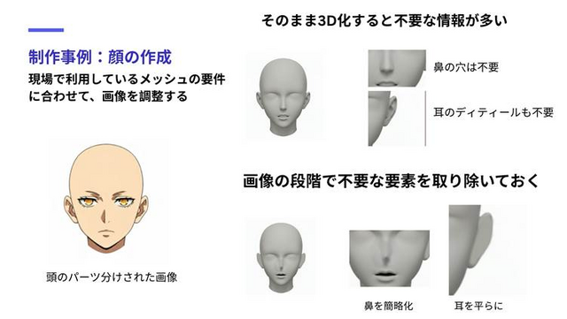 昨今、画像やテキストから3Dモデルを生成するAI技術が登場していますが、後藤氏によると「国内大手のパブリッシャーやスタジオを含め、導入に苦戦しているのが現状」だといいます。単にコンセプトアートを入力するだけでは、顔や形状が崩れた実用レベルに達しないモデルが出力されてしまうためです。