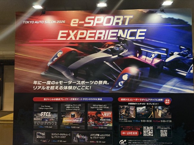 そんな熱気溢れる場所が1月9日から1月11日の3日間で開催された「東京オートサロン2026」の中にも存在していました。それが幕張メッセ内の国際会議場で開催されていた「eスポーツエクスペリエンス」です。「東京オートサロン」自体はカスタムカーの祭典ということで基本実車が主役のイベントなのですが、現代においてゲームでのシミュレーションは実車の開発や宣伝などに大きく関わっていることもあり、専用のスペースでブースやイベントが開催されていました。
