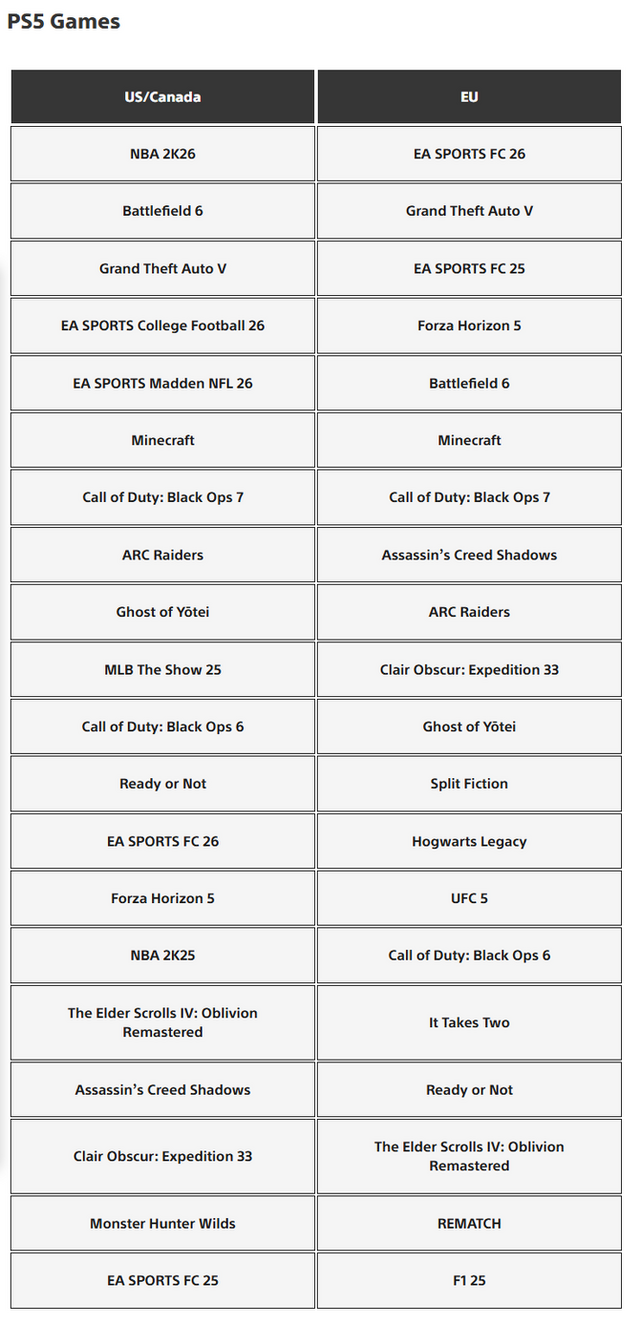 PS5部門でトップを飾ったのは北米では『NBA 2K26』欧州では『EA SPORTS FC 26』。両地域共にランクインするタイトルが目立ち、特に毎年の恒例作品と言えるスポーツゲームが上位を占めていることがわかります。また『GTA5』や『マインクラフト』といった過去作品も両地域で引き続き高い人気を維持。新作『Battlefield 6』も両地域でトップ5入りの好成績を残しています。