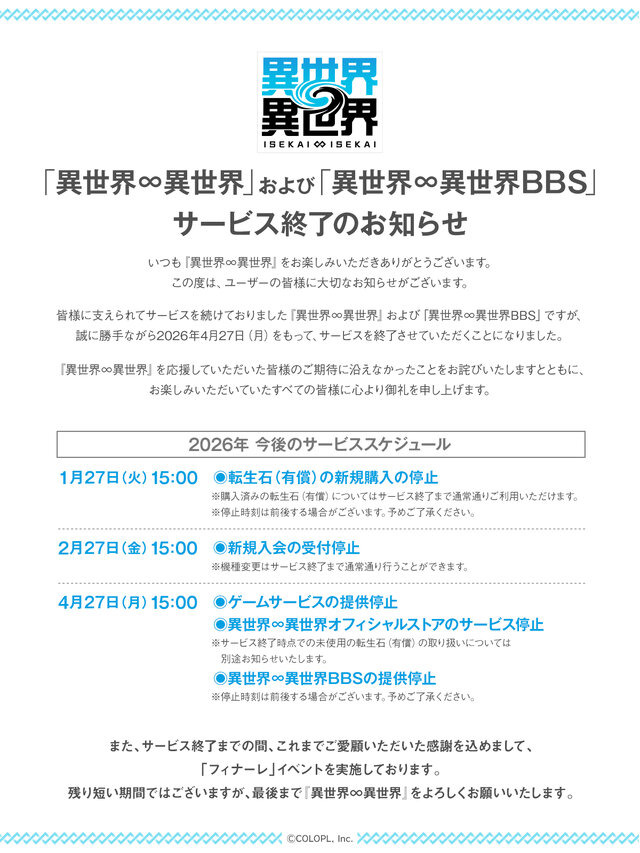 コロプラは、『異世界∞異世界 ~次はどの作品を、集めよう~(以下、異世界∞異世界)』および「異世界∞異世界BBS」が、2026年4月27日15時をもってサービスを終了すると発表しました。