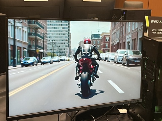 ノードを接続して処理を構築するツール「ComfyUI」を用いることで、生成工程を細かく制御でき、デモでは、バイクが走行する迫力ある4K動画が数十秒で生成されていました。