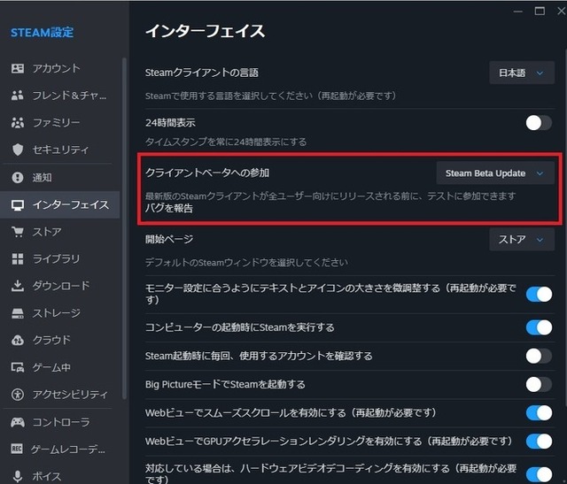 Steamクライアントベータへの参加は、Steamの設定メニューからインターフェイスタブを選び、その中にある「クライアントベータへの参加」からベータを選択します。参加時にはSteamを再起動およびアップデートする必要があります。
