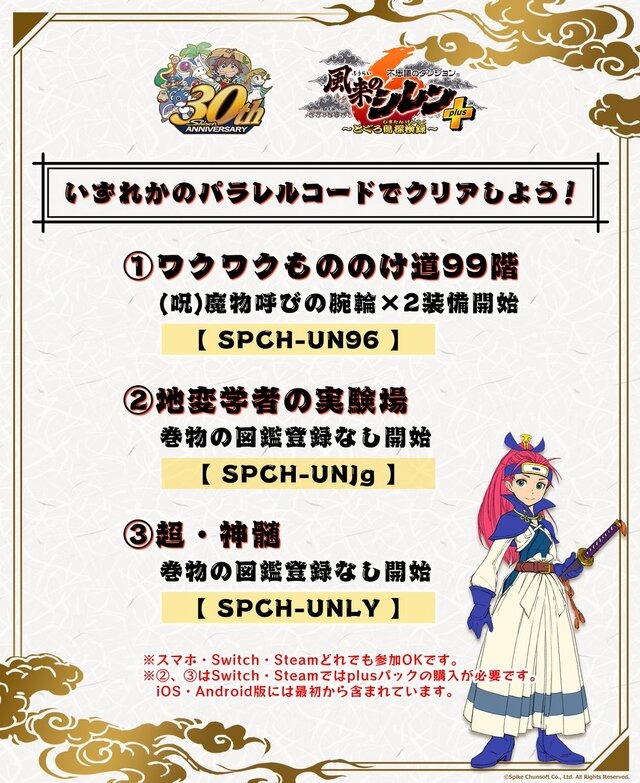 スパイク・チュンソフトは、2025年12月1日に生誕30周年を迎えた『風来のシレン』シリーズについて、全世界累計出荷本数が300万本を突破したと発表しました。