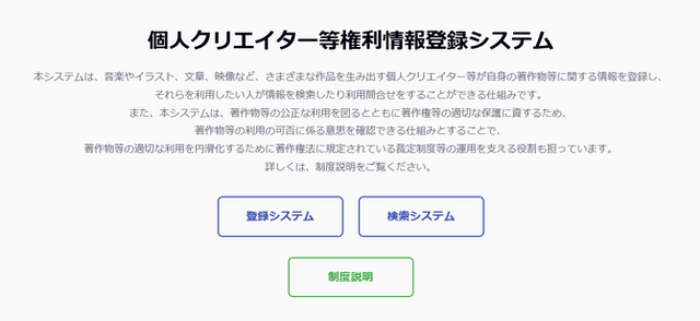 「個人クリエイター等権利情報登録システム」は、音楽・イラスト・文章・映像・ゲームの個人クリエイターが自分の作品についての権利関係の情報を登録できるシステムです。本システムに著作物の情報を登録することにより、個人クリエイター作品を検索し、迅速な問い合わせができるようになることが期待されます。