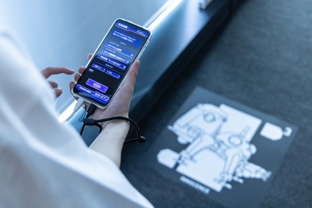 現在開催中の「攻殻機動隊展」ではそのARを「電脳VISION体験」として導入。専用スマートフォンとARグラス(XREAL)をセットでレンタルしており、それを装着することで『攻殻機動隊』シリーズと同様、視界にUI(ユーザーインターフェース)が表示されたり解説を楽しんだりすることができます。