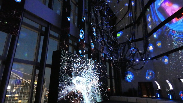 「電脳VISION体験」が楽しめるのは、通常の展示と同様、第1のアトラクションである「NODE(思考の結節点)」エリアから。ここは光と映像で魅せる空間となっており、「巨大電脳ネットワークビジュアライザー “Nerve Net”」と「“知の遺跡” “World Tree: Ghost and the Shell”」の2作品を組み合わせた、電脳空間をイメージした不思議なアトラクションとなっています。