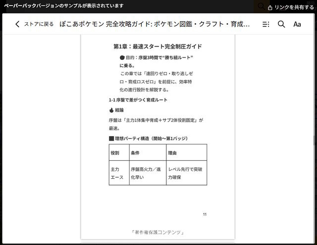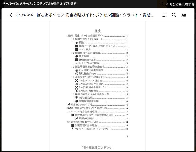 筆者が確認した『ぽこ あ ポケモン』の嘘攻略本では、「本書は情報提供および娯楽目的のために制作された独立した非公式ガイドです。本書に含まれる分析、戦略、解説はすべて著者によるオリジナル内容です」と衝撃の内容が記載。これはサンプルページを開かなければ確認できないもので、もちろんトップページの商品説明にその旨は記載されていません。