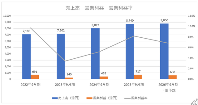 サイバーエージェントの2026年9月期第1四半期(2025年10月1日~2025年12月31日)の売上高は前年同期間比14.0%増の2,323億円、営業利益は2.8倍の233億円でした。今期は通期売上高を前期比0.7%増の8,800億円、営業利益を上限で同16.3%減の600億円と予想しています。やや弱気の予想の予想に対して、出足は2桁の増収、3倍近い営業増益と絶好調。