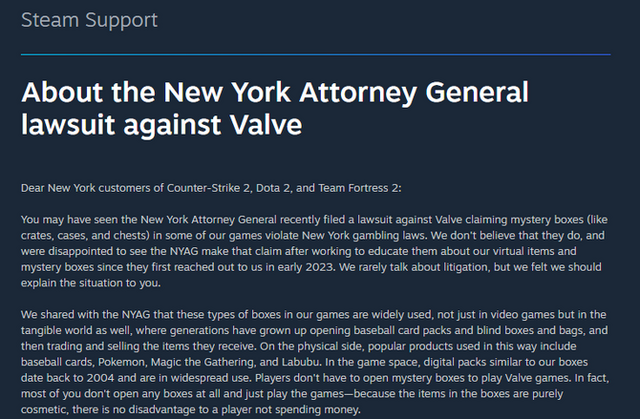 ゲーム配信プラットフォーム「Steam」を運営するValveは、ニューヨーク州司法長官(NYAG)から一部ゲーム内の「ルートボックス」を巡って提訴されていた件について、声明を発表しました。