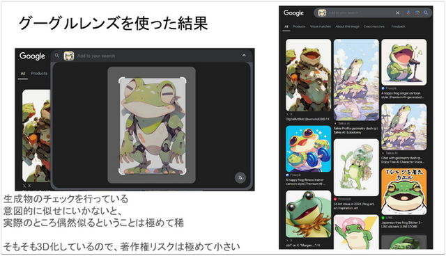 デザインの類似性についてはGoogleレンズなどを使用し、チェックを行っているそうです。新氏によれば既存のIPにはプロンプトで意図的に寄せようとしない限り、そこまでデザインが寄ることはないといいます。