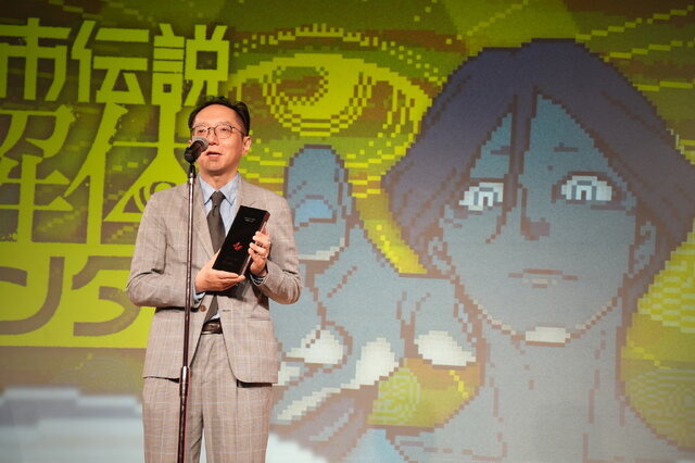 『都市伝説解体センター』の授賞式には、ゲームクリエイターのハフハフ・おでーん氏と集英社ゲームズ・プロデューサーの林真理氏が登壇。インディーゲーム業界の発展を喜びつつ、今回の賞を受け取った祝辞を述べました。
