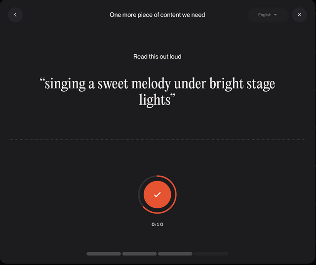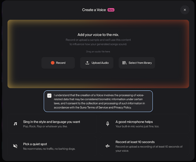 「自分の歌声」をその場で録音するかアップロード、またはSunoのライブラリから指定すると、その歌声が本人のものかどうかを検証されます。
