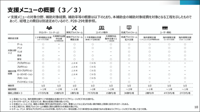 支援策は規模や用途にあわせたさまざまなメニューが用意されており、スタートアップ向けの支援では1社あたりの支援額の上限が前年から倍増した1,000万円に。大規模なコンテンツ制作への支援では、2ヶ年の計画で最大15億円までが補助金として用意されています。 さらに、海外市場を見据えたマーケティング費用の支援によって、ゲームのグローバル展開も後押しする方針です。