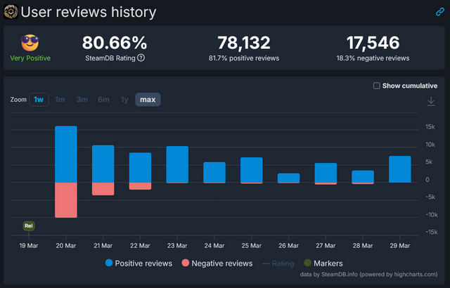 外部サイトSteamDBによると、リリース直後の3月20日から22日には低評価レビューが目立ったものの、操作性改善を行った23日のパッチ配信以降は低評価レビューはほとんどなくなり、高評価レビューが多くなっています。