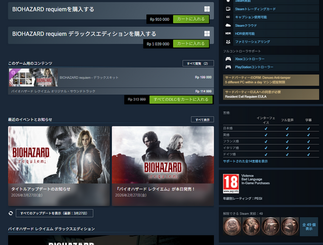 実際にインドネシアIPからSteamにアクセスすると、各ページのIGRSの年齢評価は確認できないほか、IGRS公式に“18歳以上対象”と評価されている『バイオハザード レクイエム』も欧州で採用されている年齢評価「PEGI」の方が表示されています。