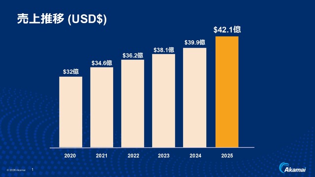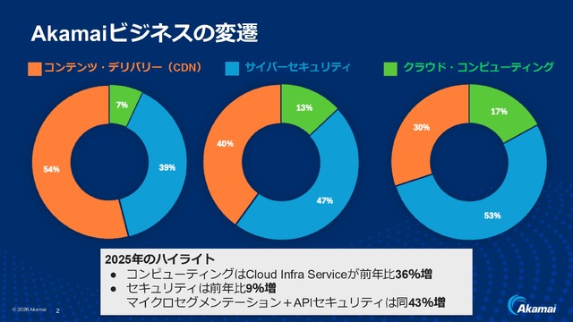 アカマイの2025年の売り上げは42.1億ドルで、年間成長率は約5%。内訳を見てみるとコンテンツ・デリバリーネットワーク(CDN)が30%、サイバーセキュリティが53%、クラウド・コンピューティングが17%となっています。