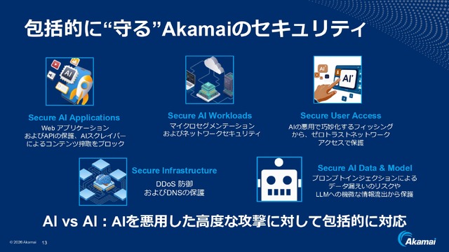 そして、AIによる高度な攻撃に包括的に対応し、防ぐのもまたAIの仕事です。アカマイではSecure AI Applications、Secure AI Workloads、Srecure User Accessなど多数のセキュリティソリューションに加え、上述のマイクロセグメンテーションをAIでさらに強固なものにするAkamai Guardicore Segmentation(AGS)を提供。SBI新生銀行、パナソニックインフォメーションシステムズなどで導入されています。