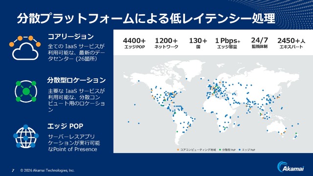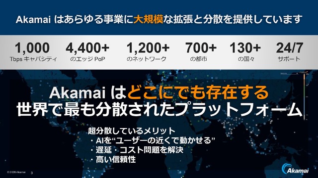 そしてこのとき、推論のために取り込むデータとAIに物理的な距離の開きがあると、処理の累積で大きな遅延を生んでしまうことがあり、UX(ユーザー経験)の低下を招きかねません。アカマイは、同社が誇る分散型プラットフォームでその解決を図ります。130超の国々、700以上の都市、4400以上の拠点によって構成される分散型プラットフォームはAIをユーザーのすぐ近くで働かせることを可能とします。