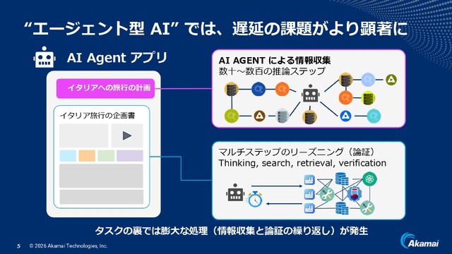 AI推論とはトレーニング済みのAIにデータを入力して予測や推論を出させたりすることで、卑近な例ではChatGPTのようなエージェント型AIに何かを質問し、返答させることもAI推論のひとつです。エージェント型AIに「イタリアへの海外旅行の計画を立ててほしい」というような入力をすると、AIはさまざまな情報を集めて取捨選択し、数十から数百回にも及ぶ推論を行います。