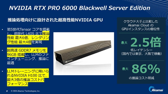 さらに、NVIDIAと手を携えたAI Inferencing Cloudが大きなアドバンテージを発揮します。アカマイは、AI推論処理向けに設計されたNVIDIAの高性能GPU「NVIDIA RTX PRO 6000 Blackwell Server Edition」を世界中の拠点に導入し始めており、日本では東京と大阪拠点に導入済み。AWS(Amazon Web Services)、Microsoft Azure、Google Cloudという3大ハイパースケーラーと比較して、最大で2.5倍の低レイテンシー、86%の推論コスト削減を実現しています。