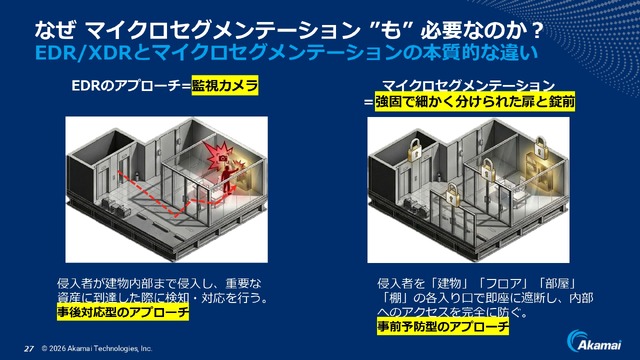 そこで重要になるのが、セキュリティ上の区画を細かく分けておくマイクロセグメンテーションなどの事前対応です。船舶において、区画の閉鎖により浸水を一部で食い止めて沈没という最悪の結果を避ける仕組みをダメージコントロールと言いますが、マイクロセグメンテーションのような事前対応はこのダメージコントロールの考え方によく似ている、と日隈氏は語ります。もちろん、事前対応だけを行えばよいというわけではなく、事前対応と事後対応の両方をバランスよく導入することが求められます。