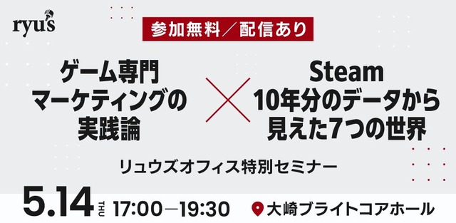 ゲーム専門のマーケティングを手がけるリュウズオフィスは、自社の知見を公開する無料セミナーを2026年5月14日(木)に開催します。会場は大崎ブライトコアホール(東京都品川区)で、YouTube Liveによるオンライン配信も同時に行います。