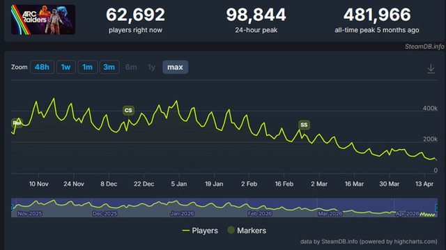 本作は2025年10月にPS5/Xbox Series X|S/Windows向けに発売されたPvPvEエクストラクションアドベンチャー。SteamDBによると、発売直後にはSteam同時接続プレイヤー数が最大で481,966人を記録し、2026年1月に入っても466,372人を記録していましたが、その後は徐々に減少して記事執筆時点(2026年4月18日)には直近24時間のピークで98,844人と最大からは約80%減少していることが確認できます。