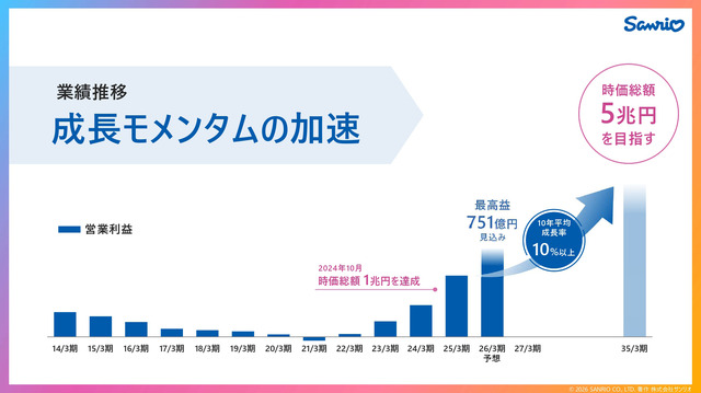 さらに、Sanrio Gamesが今後3年間で提供する10タイトルのゲームで、さらに20億時間規模の夢中時間を創出することを期待しているとのことです。10年平均成長率10%超という急成長を続けるサンリオは、ビデオゲーム事業への参入で成長にどのような影響を及ぼすでしょうか。サンリオゲーム事業参入第一弾タイトルとなるスイッチ/スイッチ2ソフト『サンリオパーティランド』は、パッケージとダウンロードの両形態で今秋にリリース予定。価格帯は、“一般的な(買い切りの)ゲームと同程度”が予定されているとのことです。