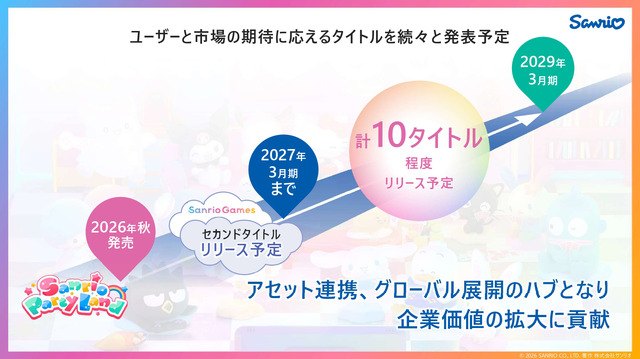 サンリオは上述の中期経営計画において、実績豊富な国内外の開発スタジオと組んで複数本のゲームタイトルを制作中であるとしていました。内訳は「コンソールとモバイルでカジュアルゲームを2本程度」「新領域・新感覚のゲームを3本程度」「ゲームを起点としたグローバルメディアミックスを3本程度」とされています。スイッチ/スイッチ2ソフト『サンリオパーティランド』はこのうちの1本であると考えられます。