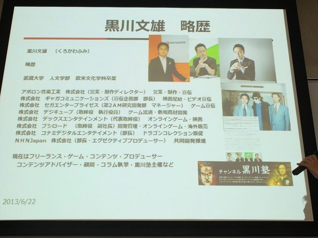 2013年6月22日、東洋美術学校で「ゲームコミュニティサミット2013」が開かれました。本イベントはゲーム開発者コミュニティによる合同イベントであり、黒川文雄氏は黒川塾の主催者として参加。現在、開発中の『モンケン』についての発表を、開発チームの飯田和敏氏、中